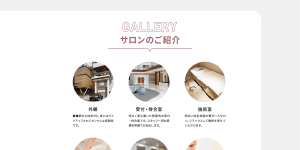 写真とキャプションを主軸に、複数のイメージを並べて掲載するブロック。商品一覧、施工事例、内観や外観の紹介などに利用できます。