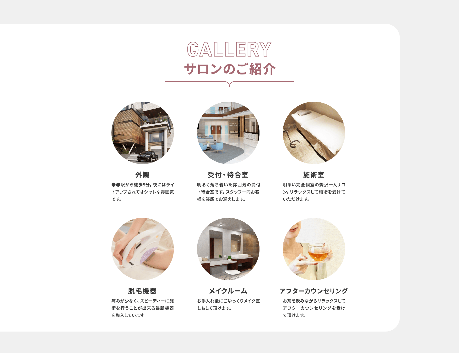 商品やサービスの内容について一歩踏み込んだ説明をし、それを利用した場合どのようなメリットがあるのかをユーザーに想像させるためのブロックです。得られる効果を瞬間的に連想できるメインビジュアルと、適切な文章で「ちゃんと読んでもらえる」ブロックを構成しましょう。長すぎる文章はまず読んでもらえません。キーワードや刺さるコピーを効果的に使い、斜め読みでも要点が伝わる内容を心がけて下さい。