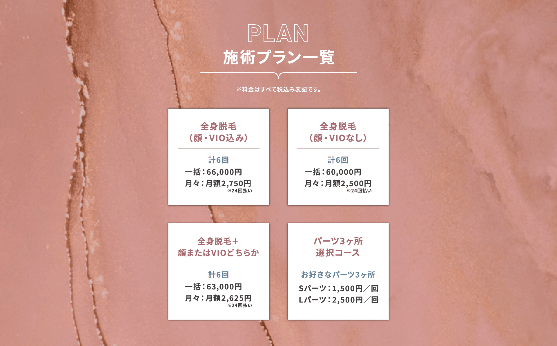 リストブロックは、同じ構成内容のテキスト情報を複数並べて掲載する場合に使用します。基本的には写真やイラストを使わず、料金表やコースの紹介、取り扱いサービス一覧などのような、テキストが主体の情報欄となります。